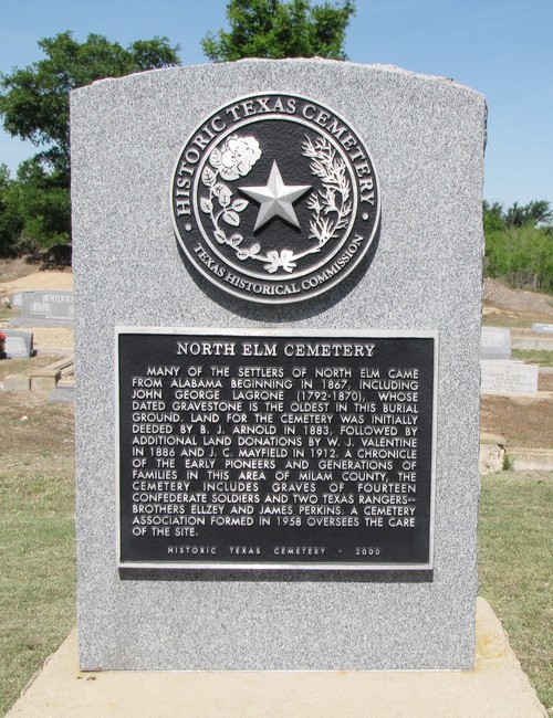The North Elm Cemetery is located in Milam County in the heart of central Texas, seven miles northwest of Cameron and thirty miles south of Waco. The Cemetery is situated on County Road 145, one mile south of Farm to Market Road 485. Across County Road 145 from the cemetery in years past there was the North Elm Church, the parsonage for its minister, and the three room North Elm school house. Only the cemetery remains today as a link to the past and the history of the North Elm Cemetery reaches out to its descendants in the immediate area, the state of Texas, and across the United States. Early pioneers of the North Elm community believed the John George Lagrone family donated the first land for the Cemetery around the time of Mr. Lagrone’s death, June 5, 1870. His was the first grave in the Cemetery. Early county records do not reflect any land deeded to the Cemetery until December 5, 1883, when B. I. Arnold deeded 6 acres from the Jose Antonio DePena League. In 1886, W. J. Valentine deeded 7 acres from the Francisco Antonio De Los Rios Survey, and in 1912, J. C. Mayfield deeded 7/10 of an acre. On March 24, 2000, the Texas Historical Commission officially listed the North Elm Cemetery as a Historic Texas Cemetery, worthy of preservation due to its historical significance and age. A medallion and marker were placed within the Cemetery grounds in the Fall 2001. |