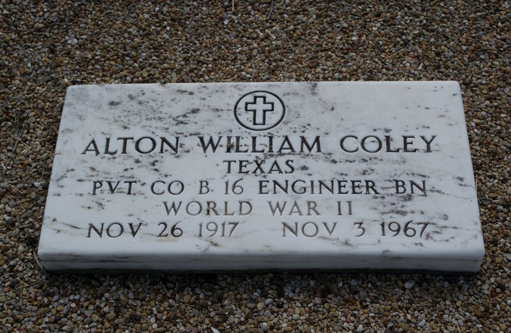 Alton W. Coley, 49, died Friday. He was born in Milam County November 26, 1917. Services were at 3 p. m. Sunday from the Marek-Burns Funeral Home, Rev. Leonard Hickman, Texas City, officiating. Burial was in the North Elm Cemetery with San Andrea Lodge 170 conducting graveside services.
