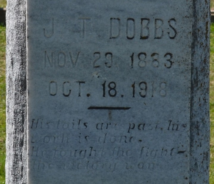 Jim Dobbs died at his home at Yarrellton last Saturday, following an attack of influenza. He leaves a wife and several children. The funeral was held on Sunday and interment made in the North Elm Cemetery. Cameron Herald, 24 Oct 1918