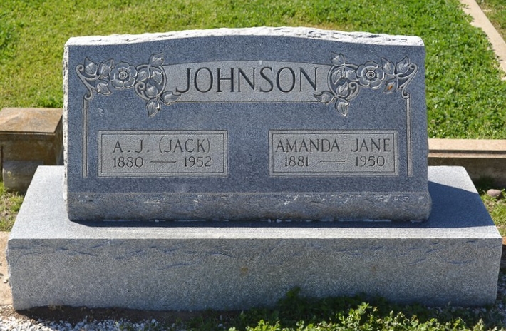 - Obituary: LAST RITES HELD FOR MRS. A. J. JOHNSON Funeral services for Mrs. A. J. (Jack) Johnson were conducted Tuesday, January 24, from the Cameron Gospel Tabernacle, with Rev. H. M. Bowley, pastor officiating, assisted by Rev. A. J. Frisby and Rev. P. L. Caperton. Burial was made in North Elm cemetery with Greens Funeral Home making the arrangements. Mrs. Johnson died at her home at East 15th Street, Monday, January 23, 1950, after a long illness. She was born Amanda Jane Ford, the daughter of R. J. and Elizabeth Ford in Tennessee, February 6, 1881. She came to Texas with her parents at the age of two and had resided here most of her life. She married A. J. Johnson in 1904. Surviving her are her husband, Jack Johnson of Cameron, two sons: Roy Johnson of Temple and Arthur Johnson of Cameron, three daughters: Mrs. Jewell Raney, Mrs. Mable Fuller and Mrs. Inita Gandy all of Cameron. Also surviving are 12 grandchildren, and two sisters and seven brothers. The Cameron Herald, 26 Jan 1950