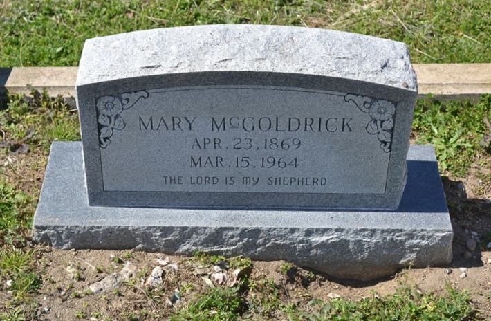 - Obituary: MRS. MCGOLDRICK, 95 DIES IN CAMERON, SERVICES HELD Funeral services for Mrs. Mary McGoldrick, age 95, who died Sunday were held Monday in the chapel of Green Funeral Home. Rev. R. D. Freeman and Rev. James Lafferty officiated. Burial was in North Elm Cemetery. Mrs. McGoldrick, who would have celebrated her 96th birthday on April 23 of this year, was born in Tennessee and moved to Texas at an early age. She made her home with her daughter, Mrs. M. A. Baggerly, for many years. She was married to Jeff McGoldrick in 1883. Surviving are: three sons, Jim Tommie and Davis McGoldrick, all of Cameron; five daughters, Mrs. Eva McDonald, Mrs. M. A. Baggerly, Mrs. Jim Rusell and Mrs. Anny Armstrong all of Cameron and Mrs. Lee Lock of Buckholts; 25 grandchildren; 50 great grandchildren and 39 great great grandchildren. The Cameron Herald, 19 Mar 1964