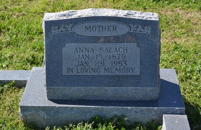 - Obituary: MRS. ANNA SALACH, 74 DIES AT NORTH ELM; SERVICES SATURDAY Mrs. Anna Salach, 74, died at her home at North Elm at 10:45 a. m. Thursday. She was born Jan. 19, 1879 in Austin county and had lived in Milam county for 43 years. She was a member of the SPJST lodge. Funeral services were scheduled at Marek-Burns funeral home at 11 a. m. Saturday, Rev. H. E. Besda of the Czech Moravian church in Caldwell conducting. Burial in North Elm Cemetery. Mrs. Salach is survived by her husband, Steve Salach, Sr.; two sons, Bennie Salach of Beaumont and Steve Salach Jr. of Cameron; two daughters, Miss Lillian Salach and Mrs. B. W. Miller of Fort Worth; two brothers, Frank Schiller and Bill Schiller of Temple; one sister, Mrs. Lillian Hertel of San Antonio; three grandchildren and two great grandchildren. The Cameron Herald, 5 Feb 1953